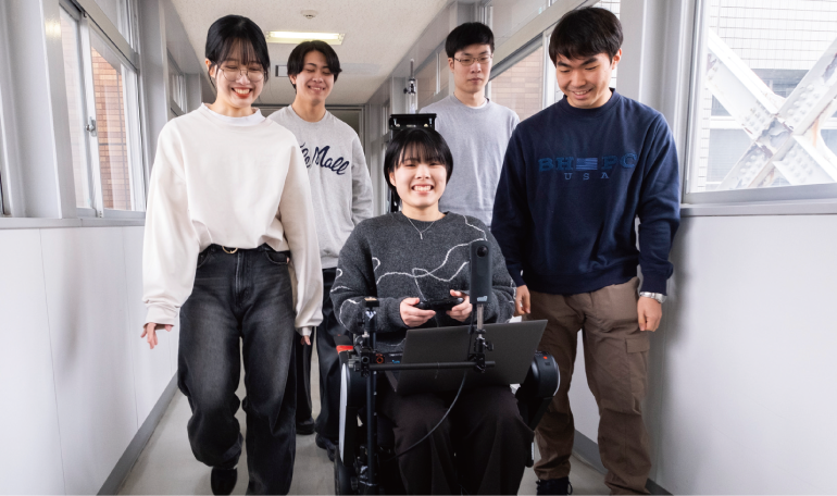 広島県内で情報系の学部がある大学を探していました。高校生のときの情報の授業で簡単なホームページ制作を体験し、何もない白紙の状態からプログラミングでサイトが形作られていくことにワクワクしました。市大の情報科学部は入学後に学科選択ができるので、入学後にやりたいことを決められる点も魅力的でした。元々とてもゲーム好きでCGに興味があったので、システム工学科で学んでいます。イノベーション人材育成プログラム(※1)にも参加し、通常のカリキュラムよりも専門性の高い授業が選択できました。3年の春に早期配属された研究室では、車いすロボットの研究を進めています。360度の全方位をカバーするカメラを用いて車いす周囲の環境を分析し、利用者の意図を視線や言語から理解させることを目指しています。