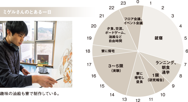 「さくら」での生活を通じてたくさんの価値観に触れ、他人を尊重する時間が増えたことは、自分の成長につながっていると思います。「エンジョイ」を合言葉に、「さくら」に関わる全ての人がとびきりの笑顔になれる、そんな場所にしたいです。市大の特徴は特色の違う3学部で構成されていることだと思います。私は情報科学部ですが、油絵に興味があるので、芸術学部の授業も取っていますし、実際に寮で制作もしています。自分の成長を自在に深められることが嬉しいです。将来的には情報科学部での学びを生かしてデータサイエンティストになれたらと思っています。異なる価値観や文化に触れる毎日を送ってきたからこそ、誰もが一緒に盛り上がれるスポーツの分野で、データを活用しながら多くの人が集まる場を作り出していきたいです。