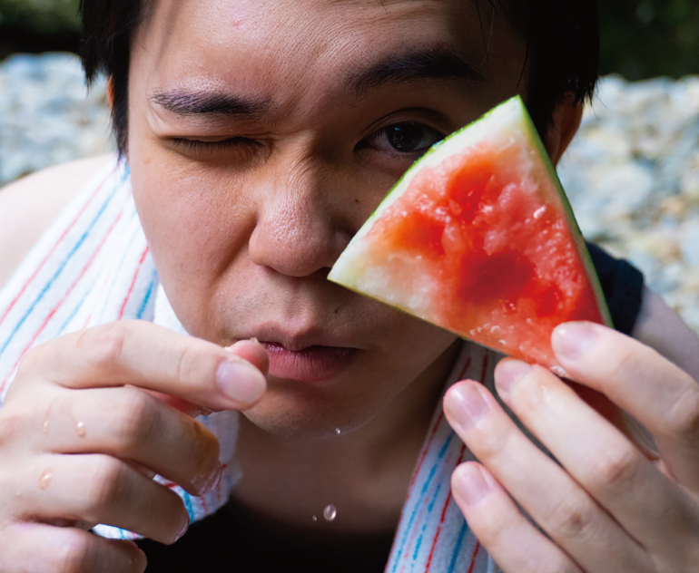 「川遊びをしたい!」という念願を叶え、川でスイカを持ってウィンクする友達のとびきりの笑顔を写真に収めました。滴る水滴、ウィンクした笑顔の一瞬が撮れたときは、達成感でいっぱいでした。その写真は、県内6大学による学生合同写真展にも出品し、写真展のポスターデザインも担当しました。企画会議では、6大学が集まる写真展ということから6枚の写真を使ったコラージュデザインを提案。一目見て写真展のポスターと分かるように、6人がそれぞれカメラのファインダーをのぞくポーズを集めて表現しました。自分の案からデザインが出来上がっていく、達成感のある経験でした。
