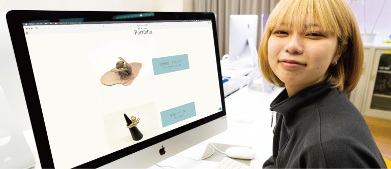 また、芸術学部にいると、自分の作品制作だけに集中しがちですが、作品を外に発信することも大切だと感じています。そのため、情報科学部の学生に混じっていちぴろ・エクスプローラ(※3)にも参加し、ウェブデザインやコーディングに取り組み、自分のポートフォリオサイトを立ち上げました。サークルを通じて他の学部の人と交流する機会が増えるだけでも、たくさんの刺激をもらえて新鮮です。