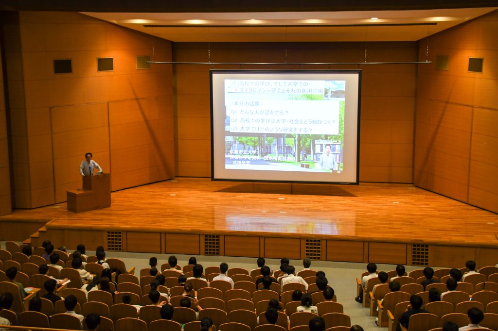 情報科学部では、ミニ講義、入試対策講座、学生による研究紹介、学生と教員による個別相談会などを実施しました。ミニ講義では、本学の教員が、「高校でのまなび、そして大学でのマイクロマシン研究とそれの医用応用」をテーマに講義を行いました。