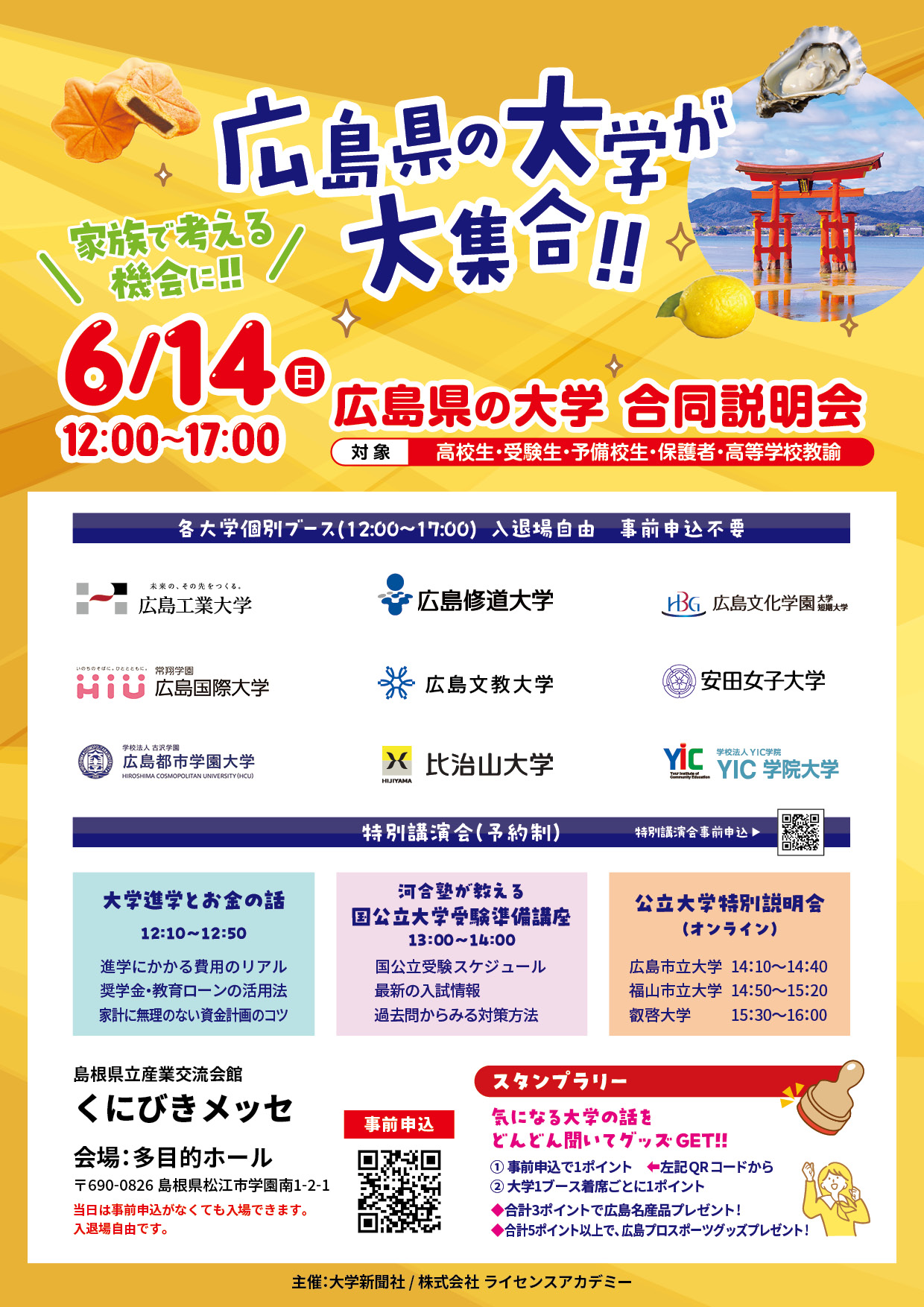 | 広島 | 9 | 23 | 水・祝 | 大学進学フェスタ in HIROSHIMA 2026(中国新聞社) | 広島県立広島産業会館 西展示館 | |