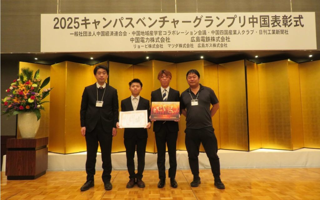 2025年7月1日(火)~10月15日(水)に開催されました学生ビジネスコンテスト「キャンパスベンチャーグランプリ中国」にて、情報科学部1年 向井健悟さんをはじめとする情報科学研究科 中山仁史准教授の研究グループの学生4名が優秀賞・広島電鉄賞を受賞し、