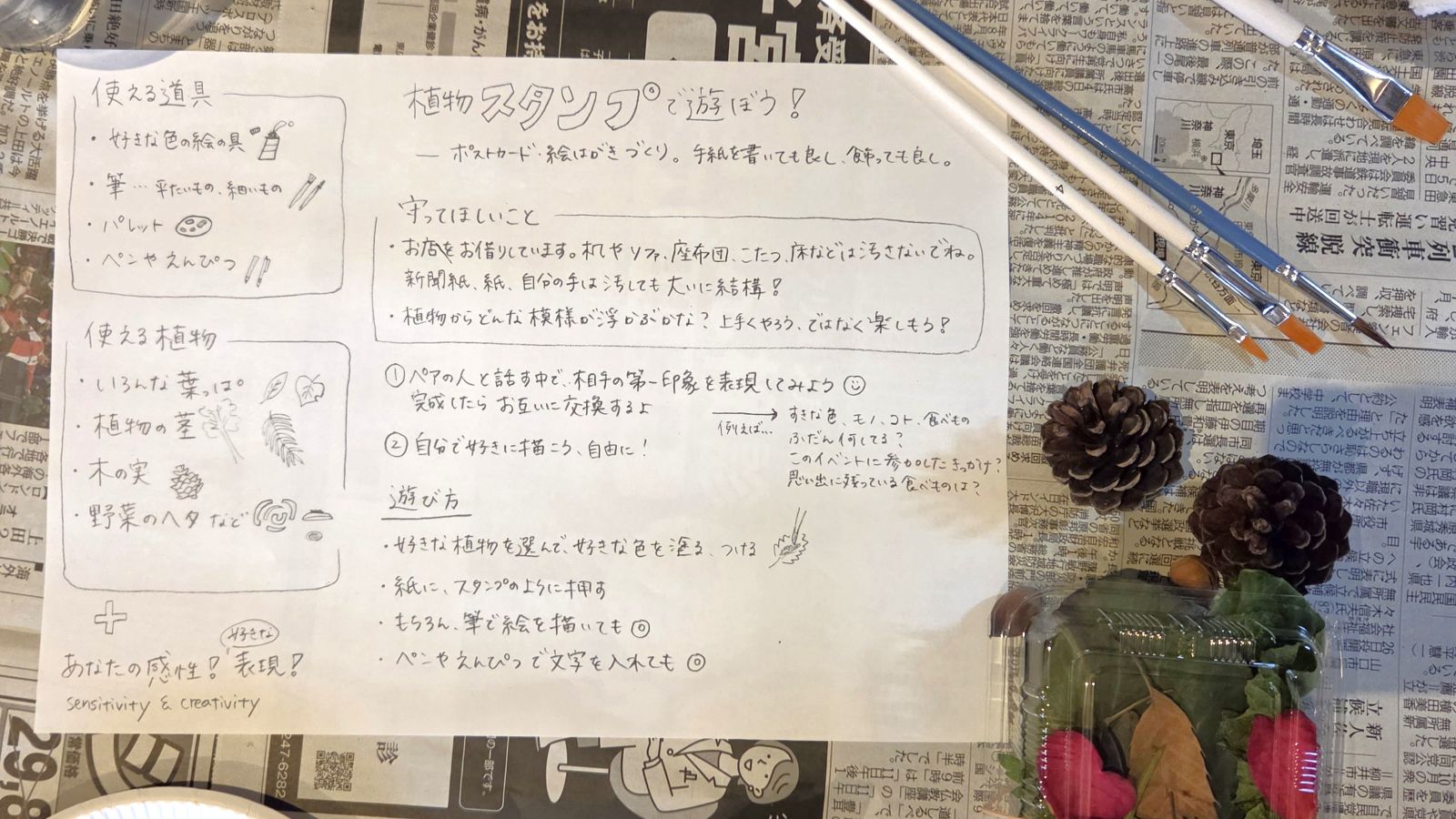 ワークショップでは、野菜や植物を使用してポストカード作りを楽しみました。